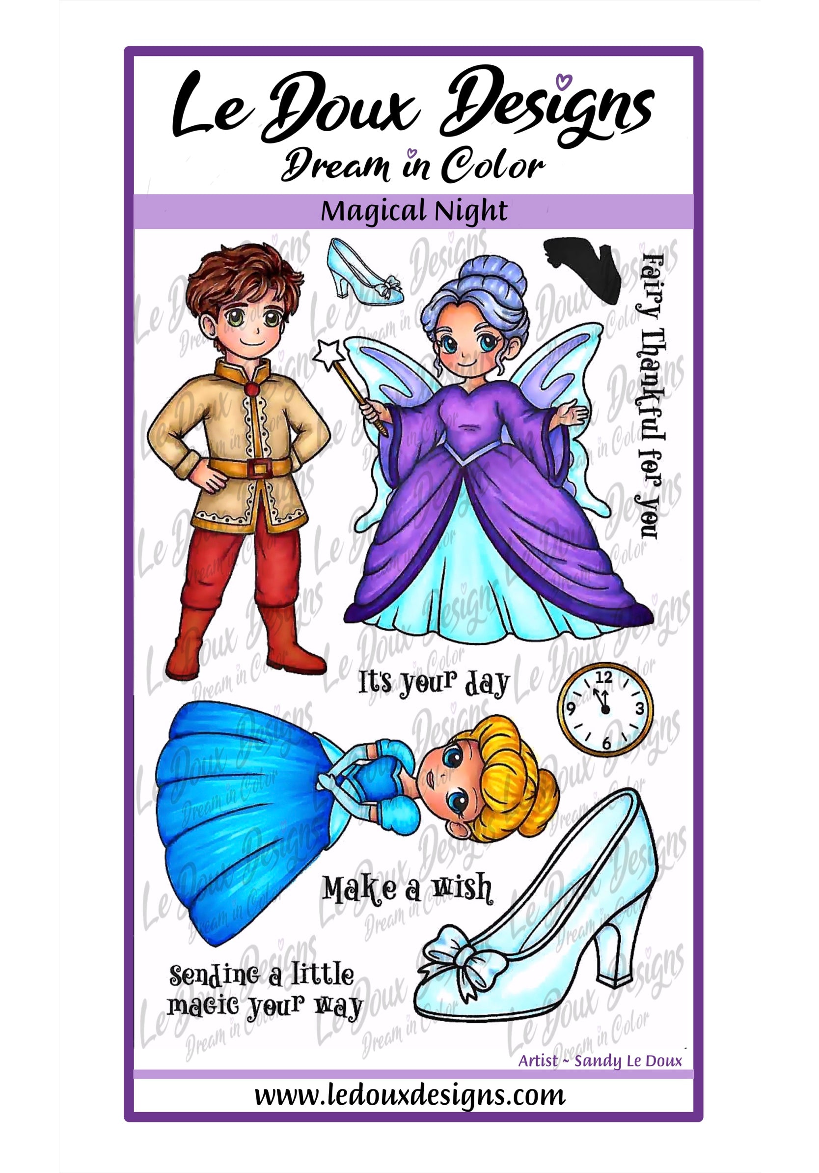 The Magical Night stamp set features a clear polymer design showcasing characters from the Cinderella fairy tale. Ideal for detailed crafting projects, these stamps provide crisp impressions with precision and clarity. Perfect for card makers and scrapbookers looking to celebrate those special occasions.