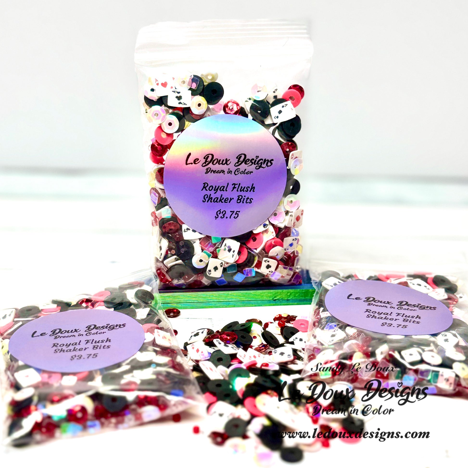 Royal Flush Shaker Bits feature hand-selected and mixed individual pieces, creating a unique blend perfect for crafting shaker cards. Each pack contains 1.5 tablespoons of these distinctive bits. Each themed mix is a unique blend and only available as supplies last.
