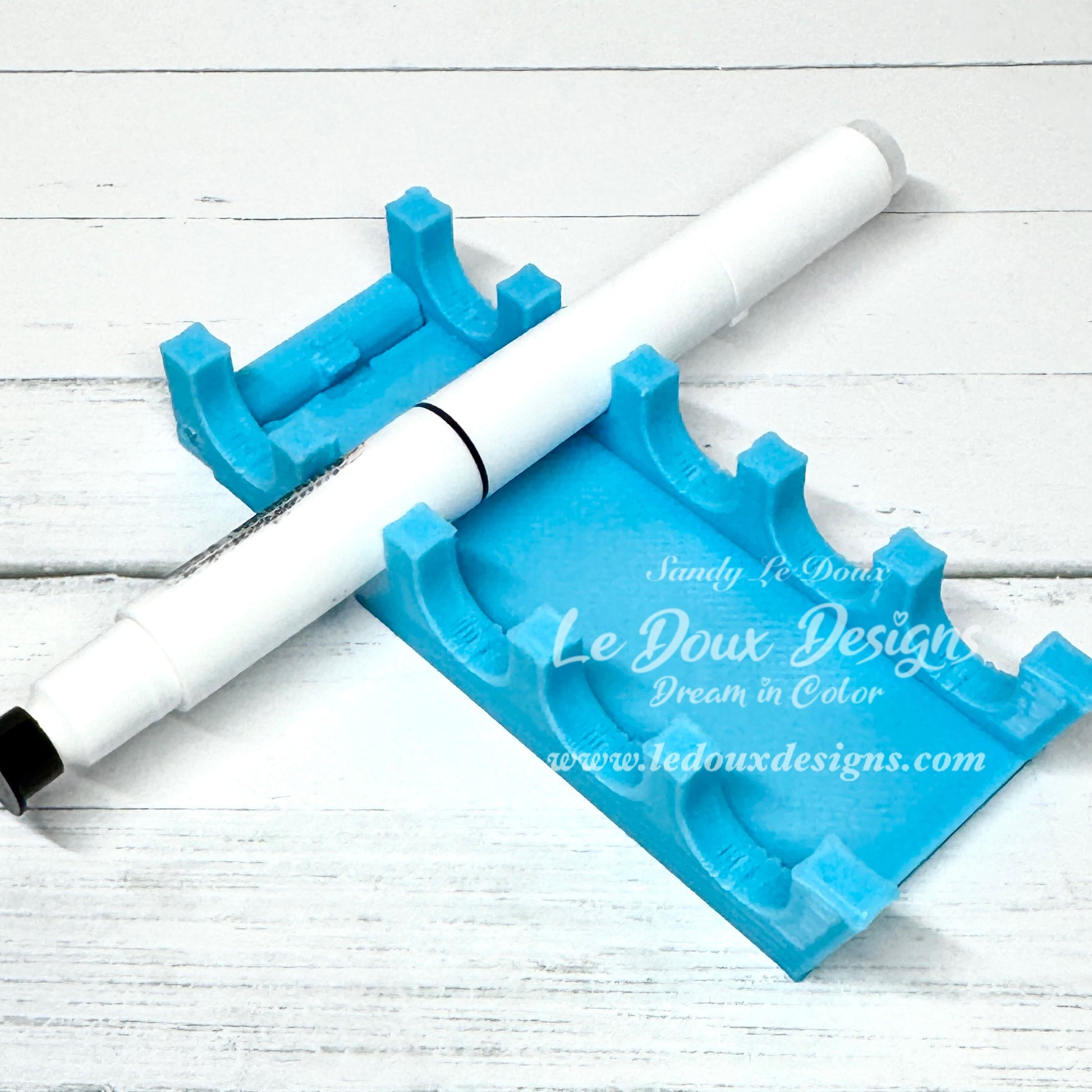 The teal 3D PLA upright marker stand is compatible with a variety of alcohol markers, providing an organized storage solution while coloring. The stand include 5 slots for markers and can be positioned flat or upright.